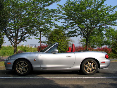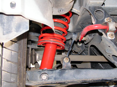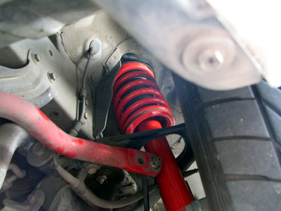 こちらはフロント側。AutoExeレッドのダンパーとスプリングが輝いています。 こちらはリア側。ビルシュタインの黄色とはまた違った趣がありますね。 こんな感じで、前後ともにバランスよく車高が下がっています。フェンダーとタイヤの間は指2本程度でしょうか。極端に落ちているわけではないので、さりげなく上品に、しかし格好よく決まっています。